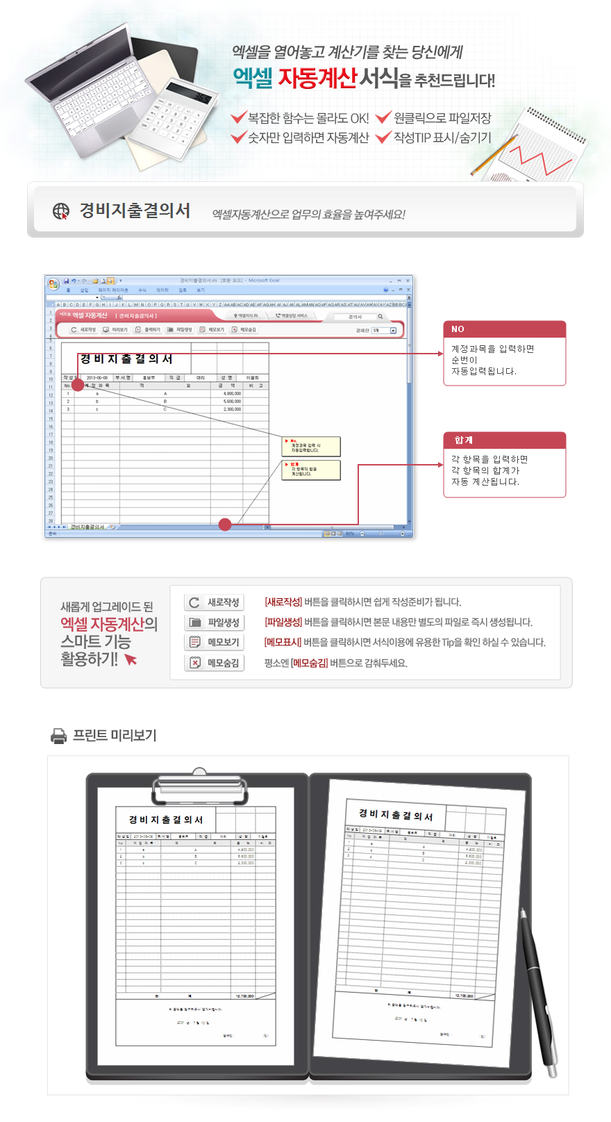 9,000원/월엑셀 자동계산 경비지출결의서입니다. 계정과목, 적요, 금액,의 항목으로 구성되어 있습니다. 금액을 입력하면 합계가 자동계산되며, 별도 파일로 저장 가능한 파일생성, 손쉽게 다시 작성이 가능한 새로작성 기능, 결재란 자동조절 기능이 포함되어 있습니다.