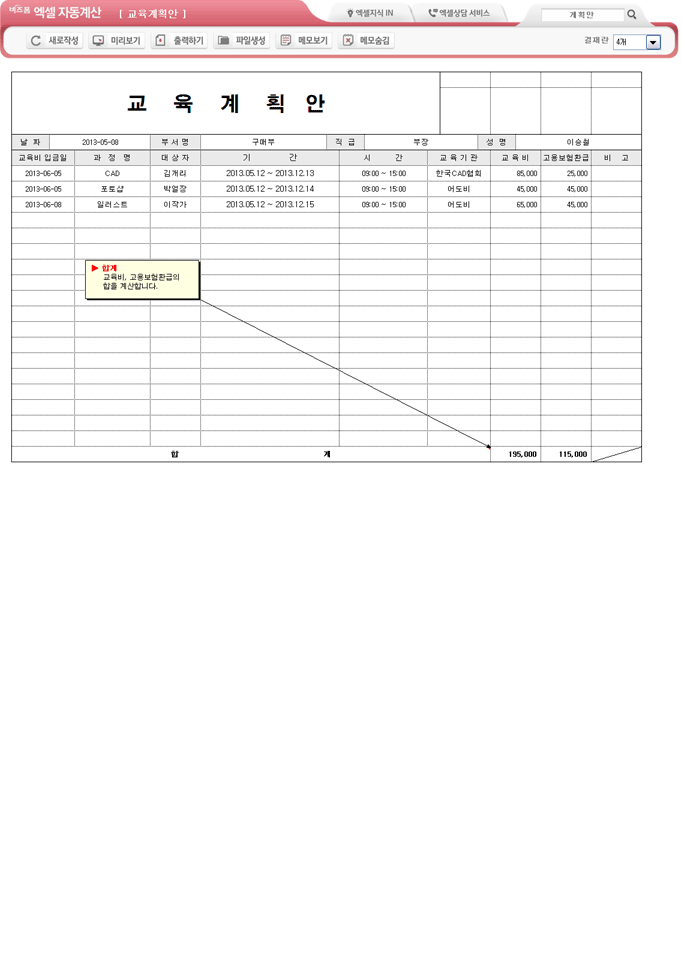 9,000원/월엑셀 자동계산 교육계획안입니다. 교육비 입금일, 과정명, 대상자, 기간, 시간, 교육기관, 교육비, 고용보험금 등의 항목으로 구성되어 있습니다. 각 항목의 합계가 자동계산되며, 별도 파일로 저장 가능한 파일생성, 손쉽게 다시 작성이 가능한 새로작성 기능, 결재란 자동조절 기능 이 포함되어 있습니다.