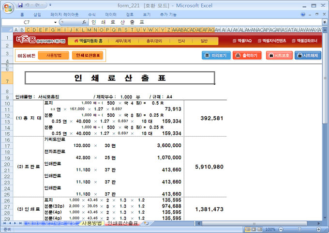 9,000원/월2004년 조달청제정 관수용 인쇄기준요금표에 기준하여 인쇄에 들어가는 비용을 손쉽게 계산할 수 있도록 만든 자동화서식입니다.