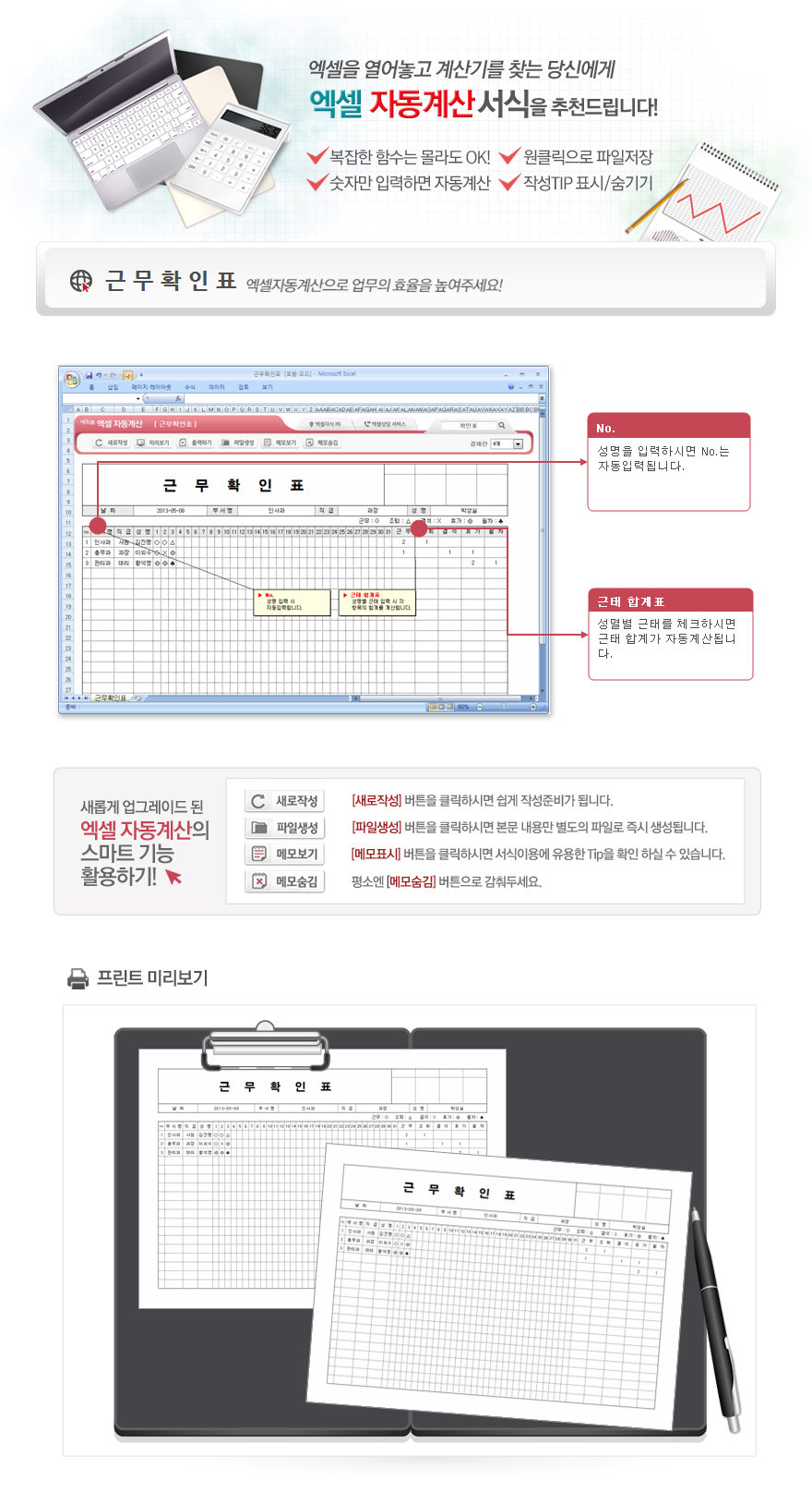9,000원/월엑셀 자동계산 근무확인표입니다. 작성자 정보와 부서명, 직급, 성명,일, 근태현황 등의 항목으로 구성되어 있습니다. 각 해당 일에 근태현황 체크 시 근태현황별로 합계가 자동계산되며, 별도 파일로 저장 가능한 파일생성, 손쉽게 다시 작성이 가능한 새로작성 기능, 결재란 자동조절 기능 이 포함되어 있습니다.