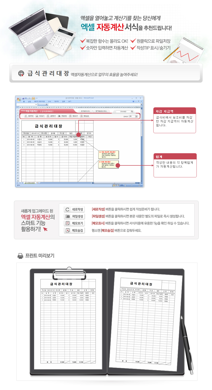 9,000원/월엑셀 자동계산 급식관리대장입니다. 날짜, 성명, 보조비, 일수, 급식비, 차감지급액, 담당자 등의 항목으로 구성되어 있습니다. 차감 지급액은 급식비-보조비로 자동계산되고, 각 항목의 합계 역시 자동계산되며, 별도 파일로 저장 가능한 파일생성, 손쉽게 다시 작성이 가능한 새로작성 기능, 결재란 자동조절 기능 이 포함되어 있습니다.