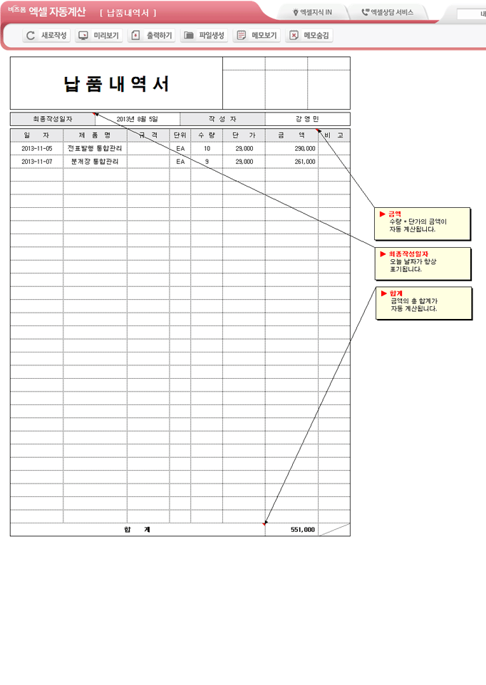 9,000원/월엑셀 자동계산 납품내역서입니다. 일자, 제품명, 규격, 단위, 수량, 단가, 금액 등의 항목으로 구성되어 있습니다. 수량*단가로 금액을 자동계산하고, 각 항목의 합계가 자동계산되며, 별도 파일로 저장 가능한 파일생성, 손쉽게 다시 작성이 가능한 새로작성 기능, 결재란 자동조절 기능 이 포함되어 있습니다.