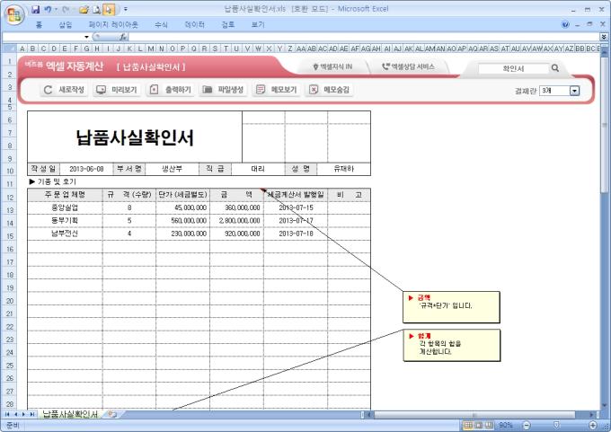 9,000원/월엑셀 자동계산 납품사실확인서입니다. 규격, 단가, 금액, 주문업체명, 세금계산서 발행일의 항목으로 구성되어 있습니다. 규격과 단가를 입력하면 금액이 계산되고, 각 자료의 합계가 자동계산되며, 별도 파일로 저장 가능한 파일생성, 손쉽게 다시 작성이 가능한 새로작성 기능, 결재란 자동조절 기능이 포함되어 있습니다.