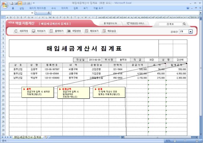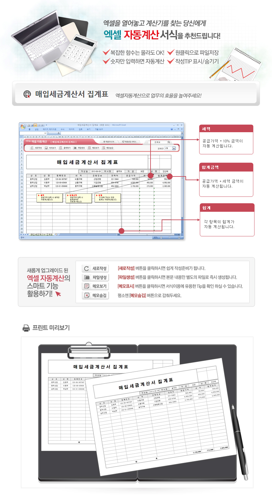 9,000원/월엑셀 자동계산 매입세금계산서 집계표입니다. 작성자 정보와 상호, 등록번호, 내역, 은행정보, 연락처, 공급가액 세액, 합계금액 등의 항목으로 구성되어 있습니다. 공갑가액의 10를 자동계산하여 세액에 입력되고, 공급가액+세액으로 합계금액이 자동계산됩니다. 그리고 각 항목의 합계가 자동계산되며, 별도 파일로 저장 가능한 파일생성, 손쉽게 다시 작성이 가능한 새로작성 기능, 결재란 자동조절 기능 이 포함되어 있습니다.