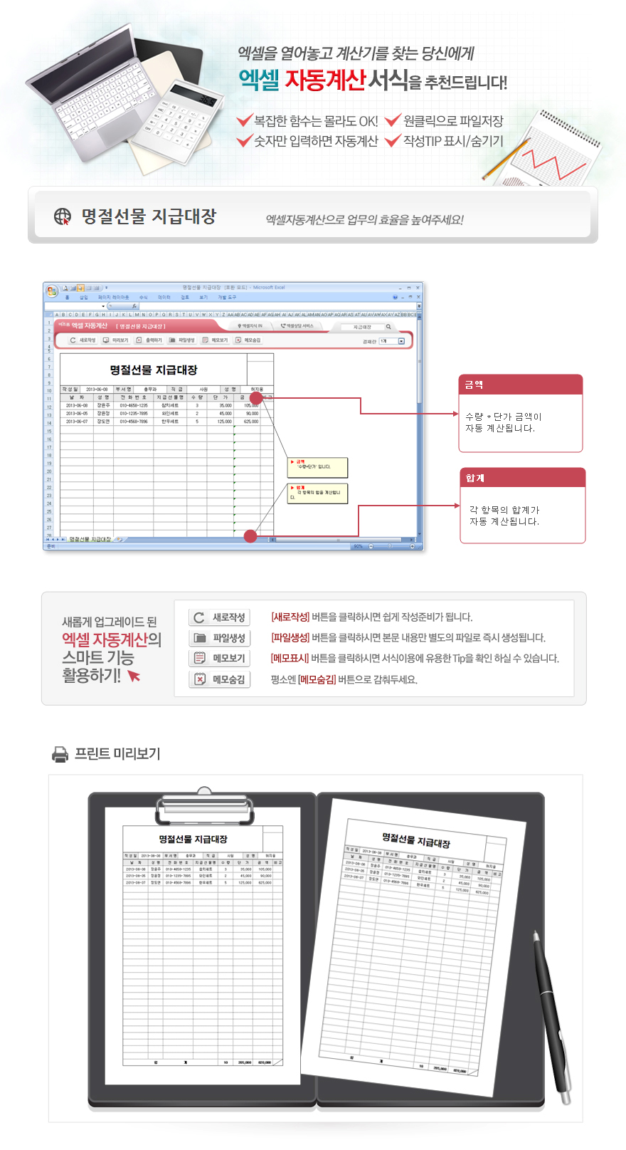 9,000원/월엑셀 자동계산 명절선물 지급대장입니다. 작성자 정보와 날짜, 정명, 전화번호, 지급선물명, 수량, 단가,금액 등의 항목으로 구성되어 있습니다. 수량*단가로 금액이 자동계산되고, 각 항목의 합계가 자동계산되며, 별도 파일로 저장 가능한 파일생성, 손쉽게 다시 작성이 가능한 새로작성 기능, 결재란 자동조절 기능 이 포함되어 있습니다.