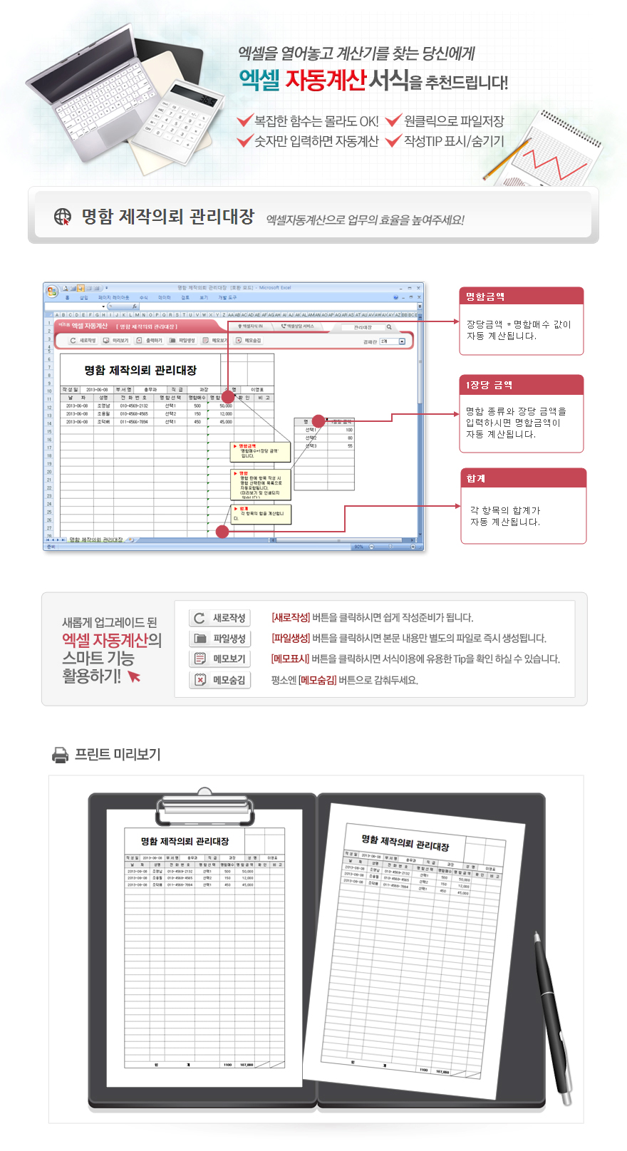 9,000원/월엑셀 자동계산 명함 제작의뢰 관리대장입니다. 작성자 정보와 날짜, 성명, 전화번호, 명함선택, 명함매수, 명함금액 등의 항목으로 구성되어 있습니다. 우측 참조표에 명함 정보 입력 후 본문 입력 시 명함금액은 매수*1장당 금액으로 자동계산되고, 각 항목의 합계가 자동계산되며, 별도 파일로 저장 가능한 파일생성, 손쉽게 다시 작성이 가능한 새로작성 기능, 결재란 자동조절 기능 이 포함되어 있습니다.