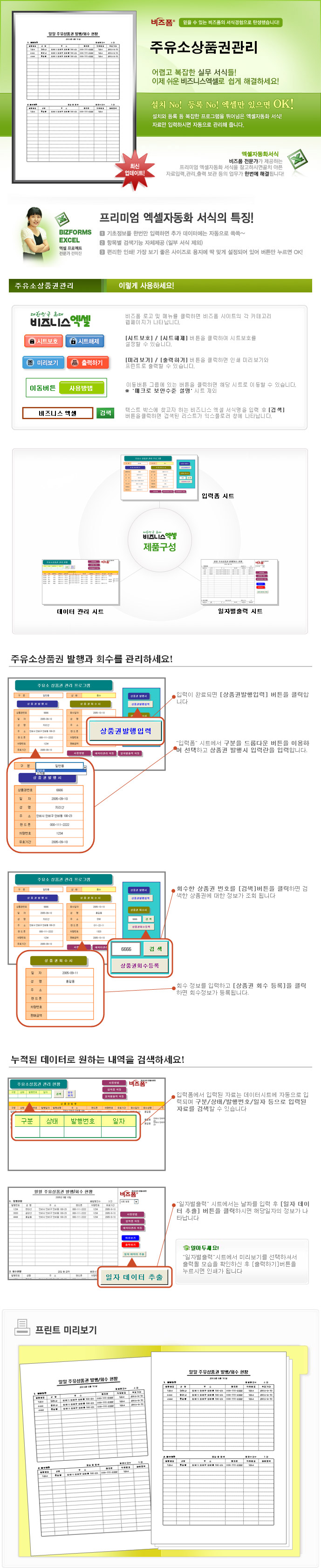 9,000원/월주유소 상품권의 발행, 회수등을 관리할 수 있는 자동화 서식으로서 입력폼, 데이터시트, 일자별발행회수 내역등으로 구성되어 있습니다. 입력폼에서 발행, 회수를 등록하면 일자별로 발행, 회수내역등을 확인 할 수 있는 자동화 서식입니다
