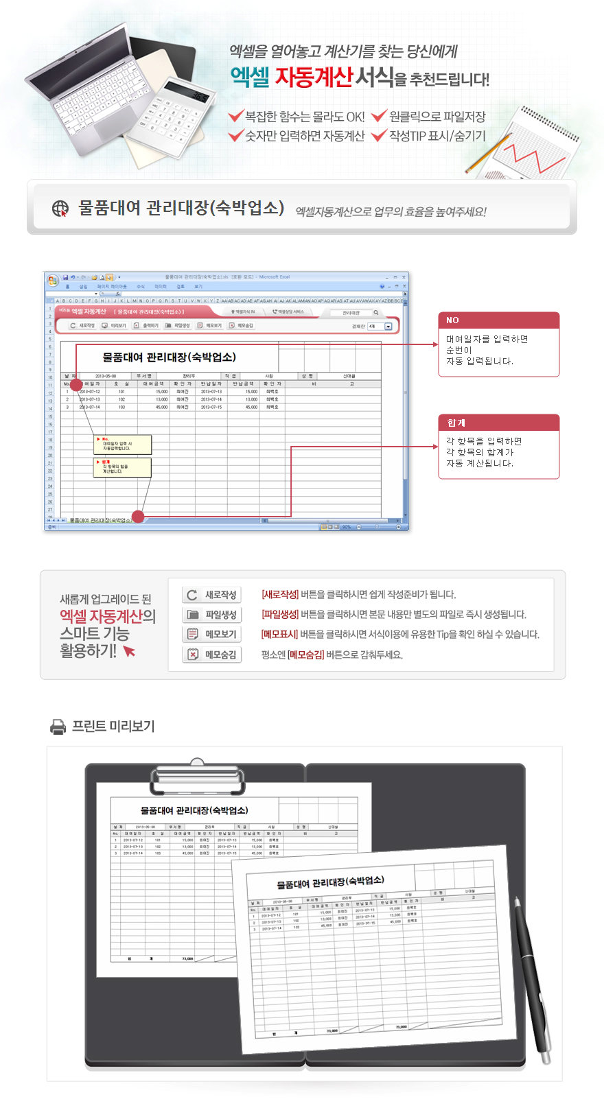 9,000원/월엑셀 자동계산 물품대금청구서입니다. 수신, 내용, 거래일자, 품명, 규격, 수량, 단가, 금액 등의 항목으로 구성되어 있습니다. 단가*수량으로 금액이 자동계산되고, 각 항목의 합계가 자동계산되며, 별도 파일로 저장 가능한 파일생성, 손쉽게 다시 작성이 가능한 새로작성 기능 이 포함되어 있습니다.