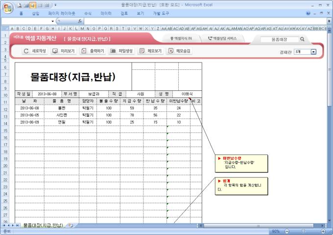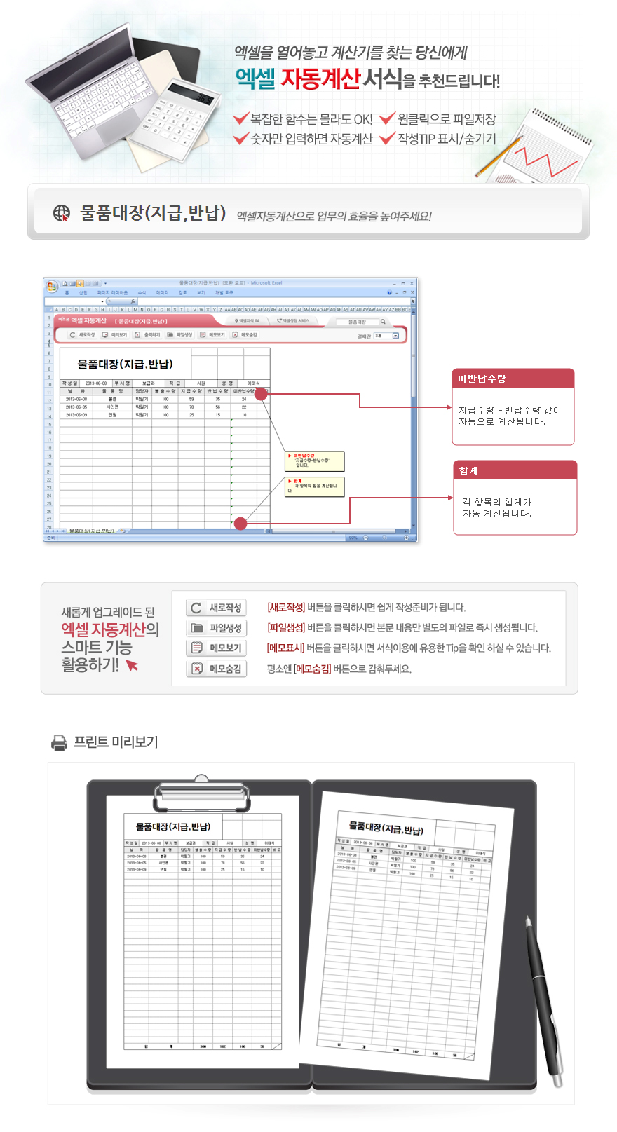 9,000원/월엑셀 자동계산 물품대장(지급,반납)입니다. 작성자 정보와, 날짜, 물품명, 담당자, 불출량, 지급수량, 반납수량, 미반납수량 등의 항목으로 구성되어 있습니다. 지급수량-반납수량으로 미반납수량이 자동계산되고, 각 항목의 합계가 자동계산되며, 별도 파일로 저장 가능한 파일생성, 손쉽게 다시 작성이 가능한 새로작성 기능, 결재란 자동조절 기능 이 포함되어 있습니다.