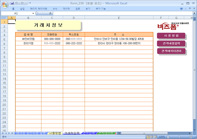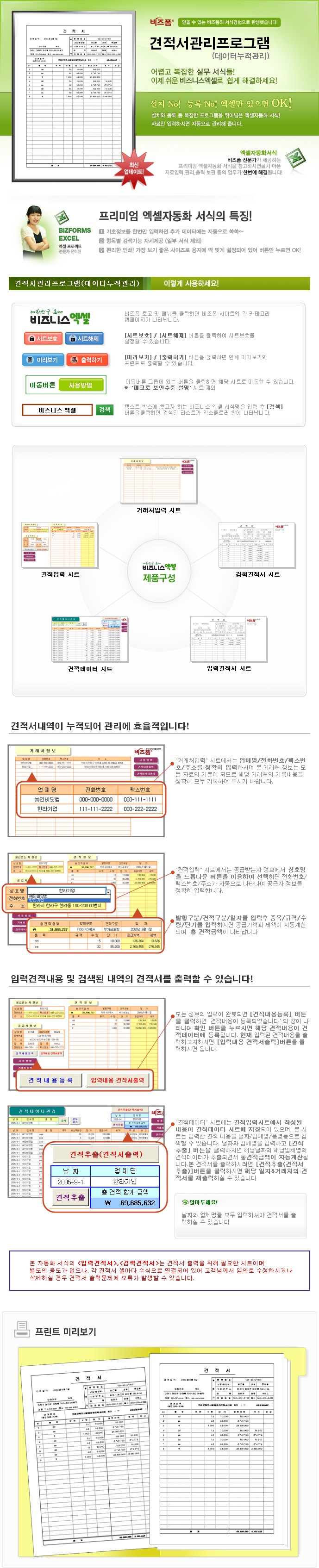 9,000원/월거래처정보, 견적정보를 입력 후 견적내용을 저장하여 각 항목별로 검색하여 견적데이터를 확인할 수 있으며 입력된 견적데이터를 견적서양식에 따라 출력할 수 있으며 일자와 거래처명을 입력 후 검색결과에 맞는 견적서를 출력할 수 있는 자동화서식입니다. 견적데이터를 누적하여 관리할 수 있어 효율적인 견적서관리에 효과적인 자동화 서식입니다