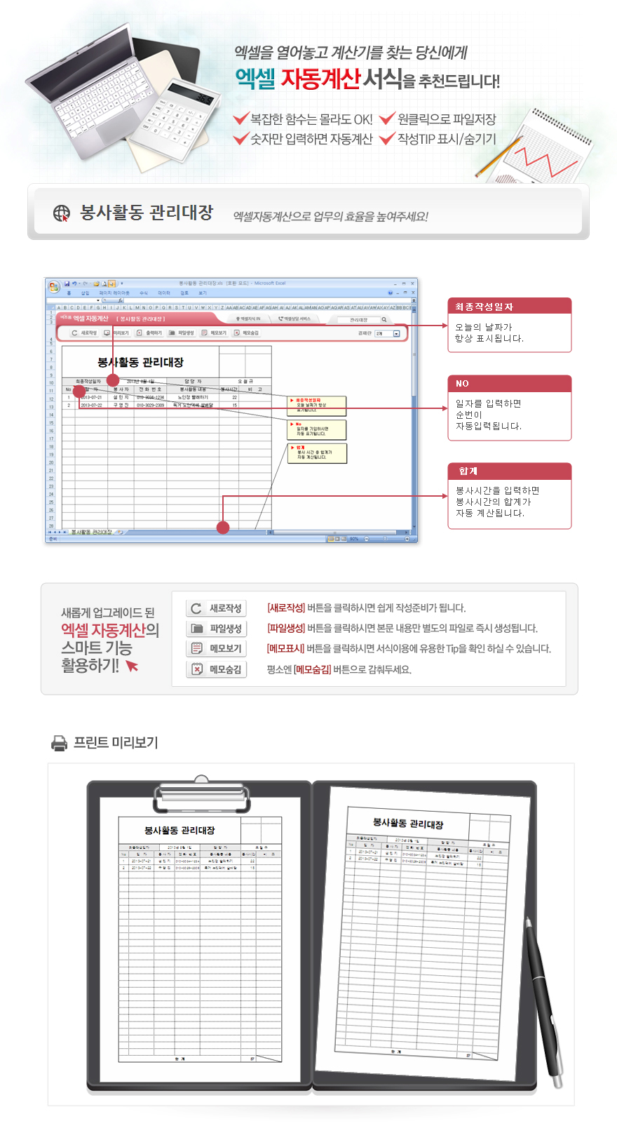 9,000원/월엑셀 자동계산 봉사활동 관리대장입니다. 일자, 봉사자, 전화번호, 봉사황동 내용, 봉사시간 등의 항목으로 구성되어 있습니다. 최종작성일자는 항상 작성당일로 자동입력되고, 봉사시간의 합계가 자동계산되며, 별도 파일로 저장 가능한 파일생성, 손쉽게 다시 작성이 가능한 새로작성 기능, 결재란 자동조절 기능 이 포함되어 있습니다.