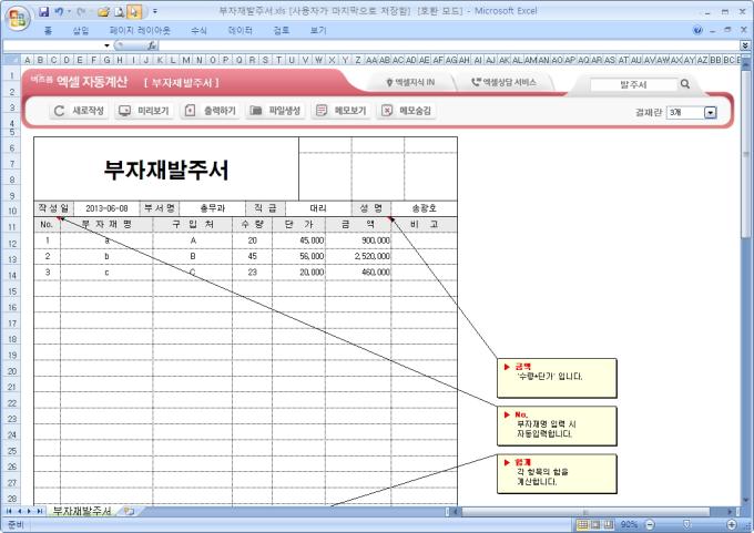 9,000원/월엑셀 자동계산 부자재발주서입니다. 부자재명, 구입처, 수량, 단가, 금액의 항목으로 구성되어 있습니다. 수량과 단가를 입력하면 금액이 계산되고, 각 자료의 합계가 자동계산되며, 별도 파일로 저장 가능한 파일생성, 손쉽게 다시 작성이 가능한 새로작성 기능, 결재란 자동조절 기능이 포함되어 있습니다.