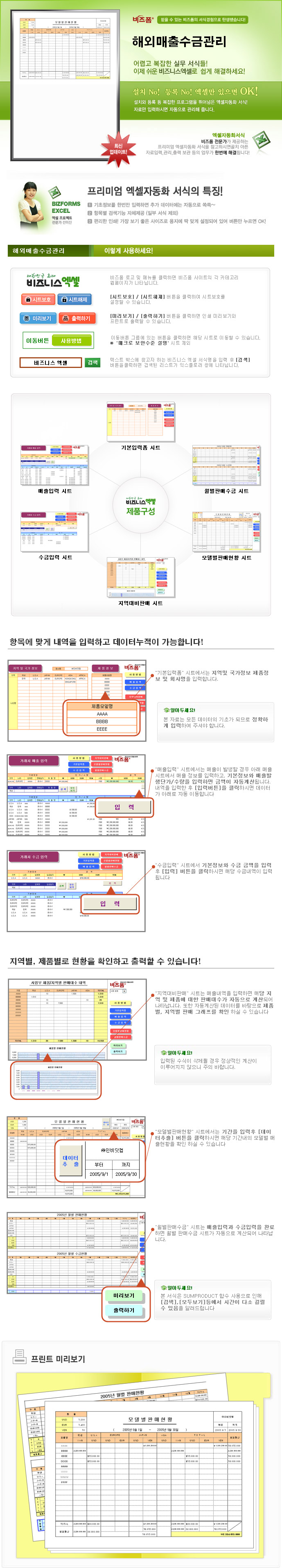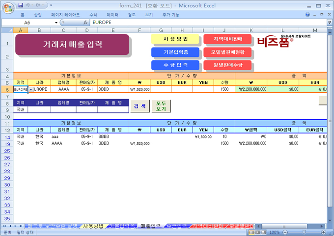9,000원/월해외 매출 수금관리를 할 수 있는 자동화 서식으로서 매출입력,수금입력으로 지역별,제품별 판매현황 및 각 월의 판매 수금 내역을 지역별, 제품별로 확인할 수 있는 자동화 서식 입니다. 또한 환율을 월 단위로 적용할 수 있어 원화환산의 기능도 첨부되어 있어 해외거래처를 두고 있는 사업장에 유리한 서식입니다.