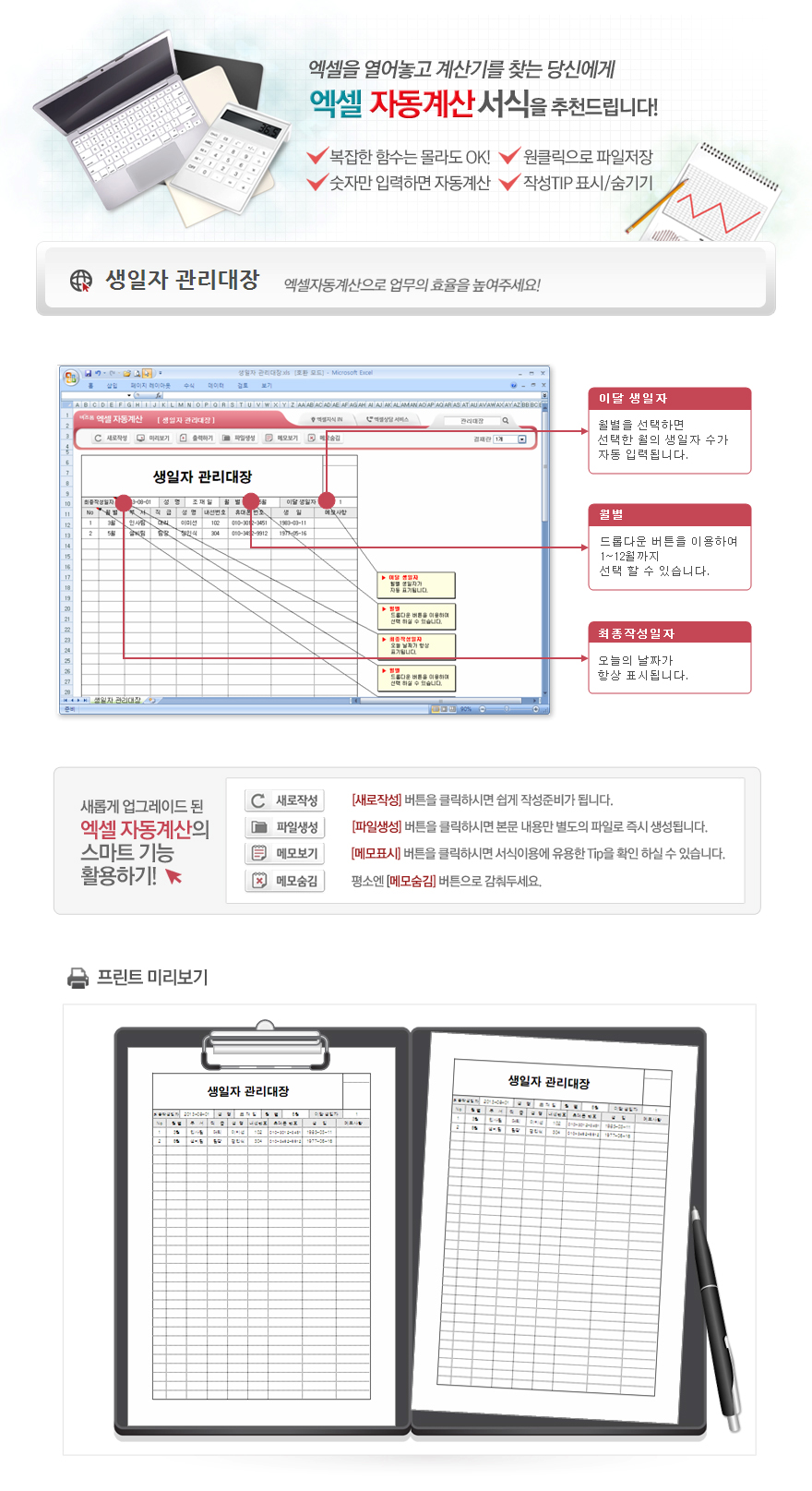 9,000원/월엑셀 자동계산 생산지시 통보서입니다. 거래처명, 제품명, 예정샌산일, 규격, 수량, 단가, 금액 등의 항목으로 구성되어 있습니다. 단가*수량으로 금액이 자동계산되고, 금액의 합계가 자동계산되며, 별도 파일로 저장 가능한 파일생성, 손쉽게 다시 작성이 가능한 새로작성 기능, 결재란 자동조절 기능 이 포함되어 있습니다.
