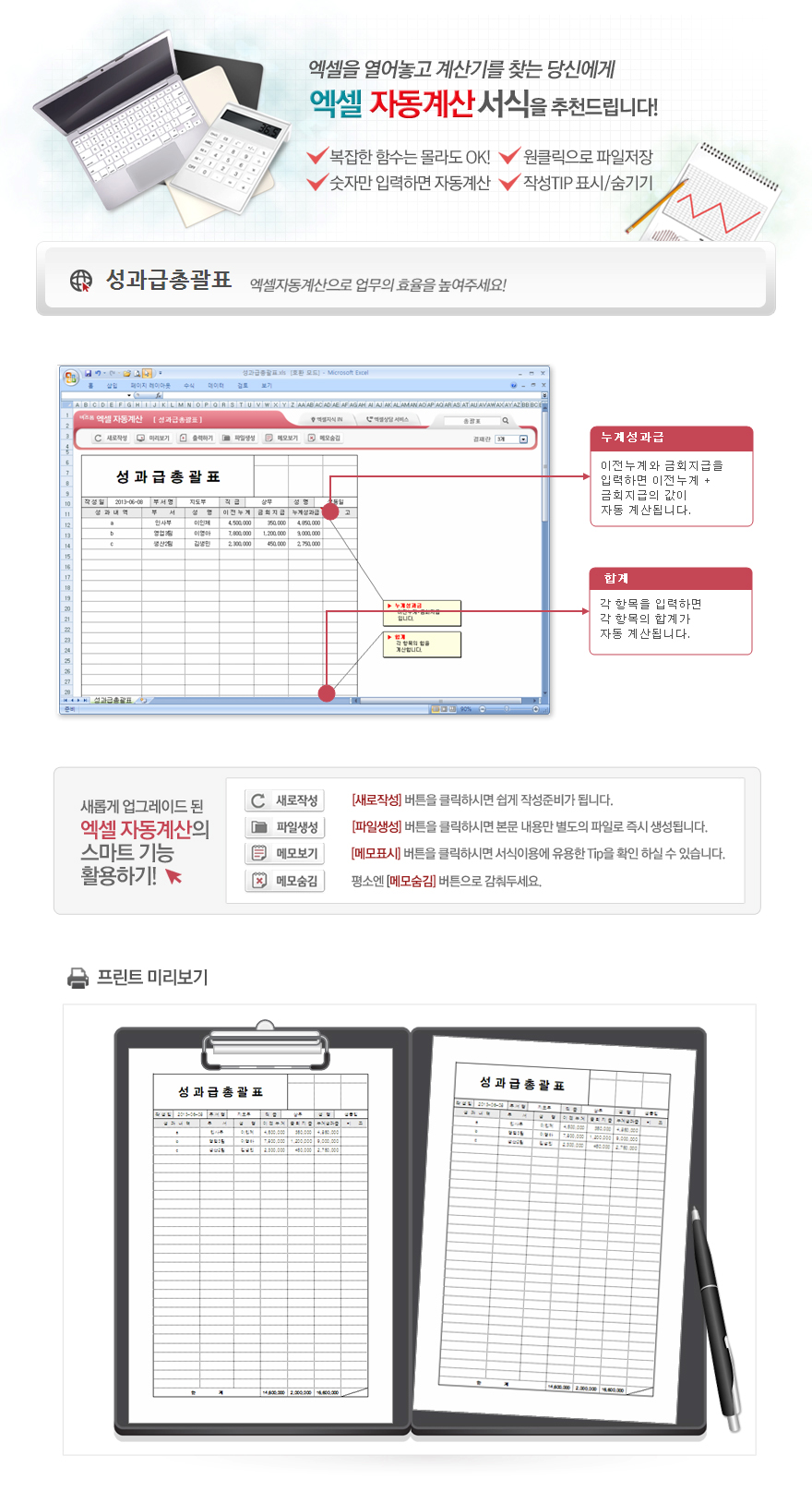 9,000원/월엑셀 자동계산 성과급총괄표입니다. 성과내역, 부서, 이전누계, 금회지급, 누계성과급의 항목으로 구성되어 있습니다. 이전누계, 금회지급을 입력하면 누계성과급이 계산되고, 각 항목의 합계가 자동계산되며, 별도 파일로 저장 가능한 파일생성, 손쉽게 다시 작성이 가능한 새로작성 기능, 결재란 자동조절 기능이 포함되어 있습니다.
