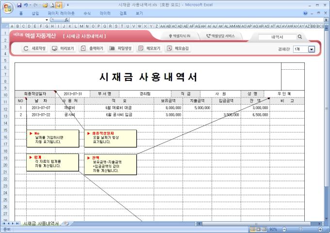 9,000원/월엑셀 자동계산 시재금 사용내역서입니다. 사용처, 적요, 보유금액, 지출금액, 입금금액, 잔액의 항목으로 구성되어 있습니다. 보유금액, 지출금액, 입금금액을 입력하면 잔액이 계산되고, 각 자료의 합계가 자동계산되며, 별도 파일로 저장 가능한 파일생성, 손쉽게 다시 작성이 가능한 새로작성 기능, 결재란 자동조절 기능이 포함되어 있습니다.