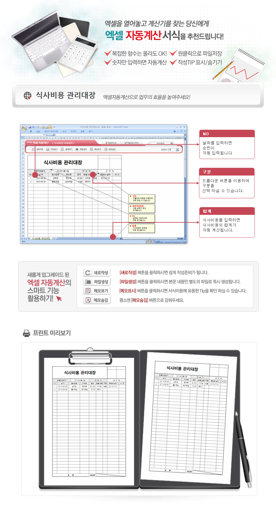 9,000원/월엑셀 자동계산 식사비용 관리대장입니다. 날짜, 음식점명, 메뉴, 금액 등의 항목으로 구성되어 있습니다. 최종작성일자는 항상 작성당일로 자동입력되고, 금액의 합계가 자동계산되며, 별도 파일로 저장 가능한 파일생성, 손쉽게 다시 작성이 가능한 새로작성 기능, 결재란 자동조절 기능 이 포함되어 있습니다.