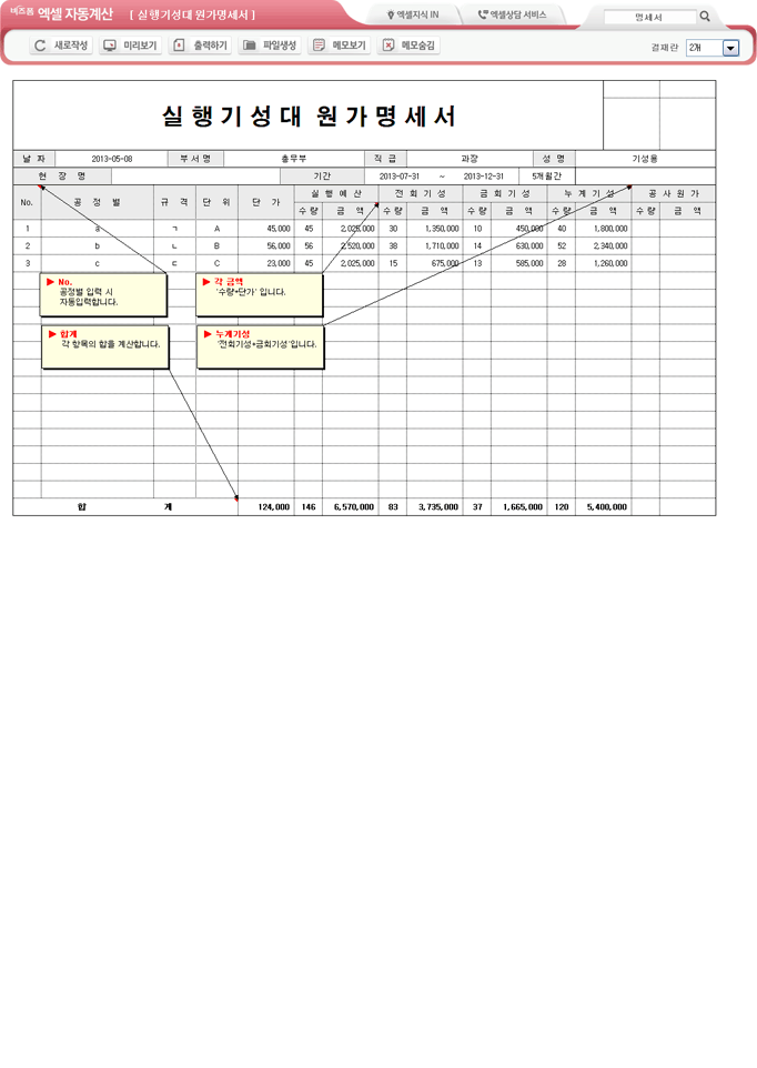 9,000원/월엑셀 자동계산 실행기성대 원가명세서입니다. 실행예산, 전회기성, 금회기성, 누계기성, 공사원가의 항목으로 구성되어 있습니다. 수량과 금액을 입력하면 금액이 전회기성과 금회기성을 입력하면 누계기성이 계산되고, 각 자료의 합계가 자동계산되며, 별도 파일로 저장 가능한 파일생성, 손쉽게 다시 작성이 가능한 새로작성 기능, 결재란 자동조절 기능이 포함되어 있습니다.