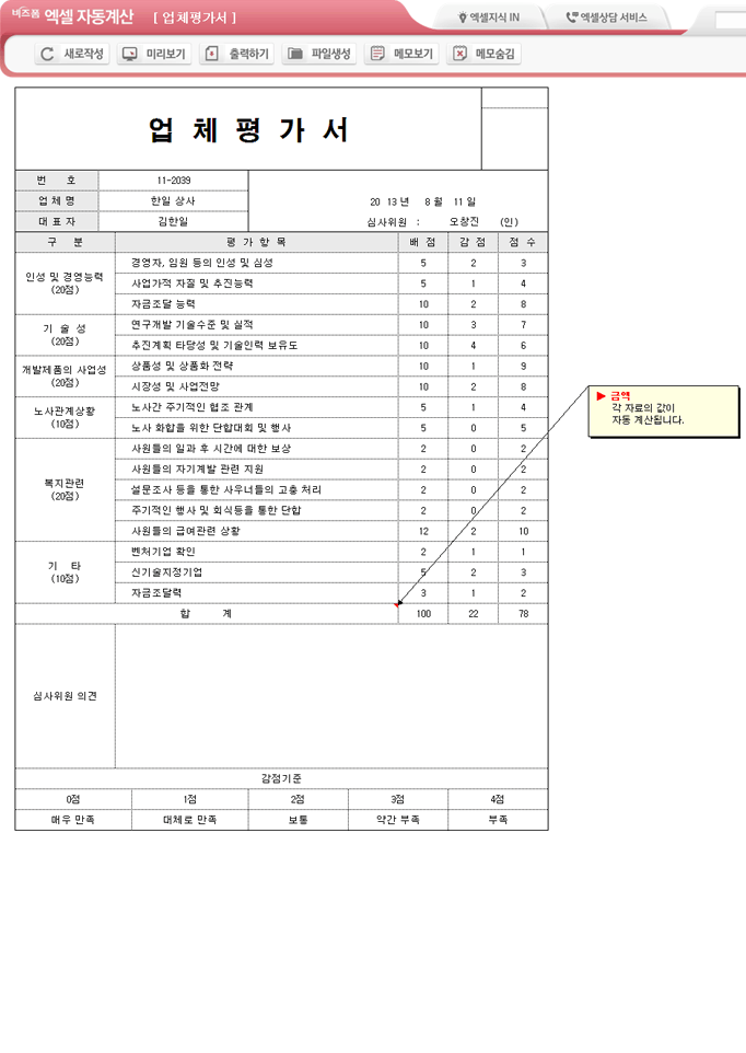 9,000원/월엑셀 자동계산 업체평가서입니다. 평가항목, 배점, 감점, 점수, 합계, 심사위원 의견의 항목으로 구성되어 있습니다. 배점, 감점, 점수의 합계를 자동계산되며, 별도 파일로 저장 가능한 파일생성, 손쉽게 다시 작성이 가능한 새로작성 기능, 결재란 자동조절 기능이 포함되어 있습니다.