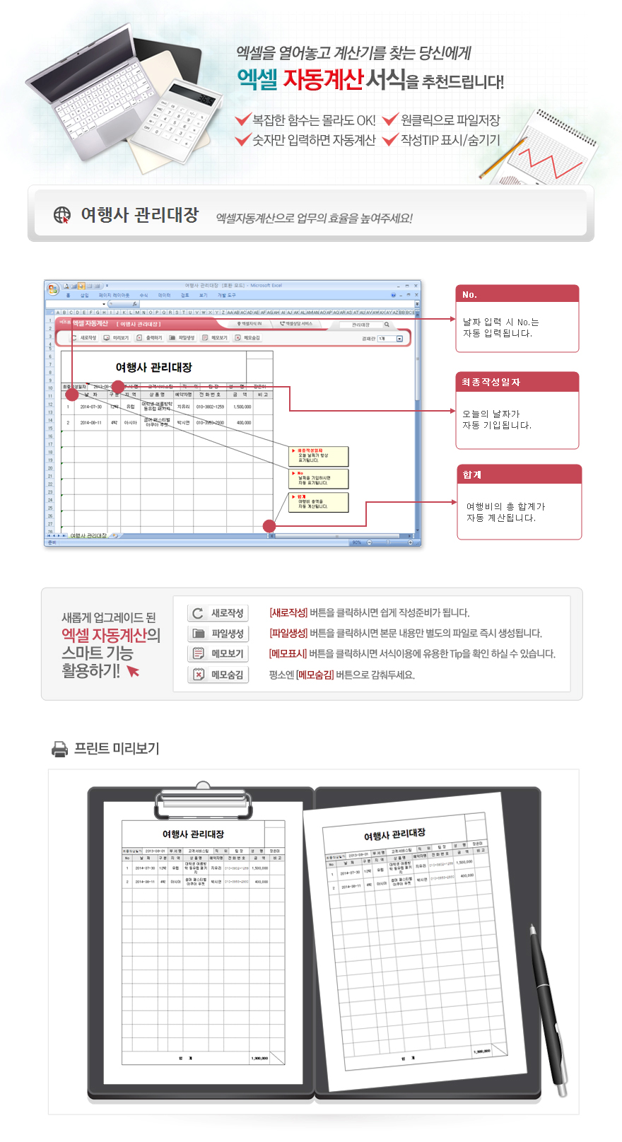 9,000원/월엑셀 자동계산 여행사 관리대장입니다. 최종작성일자, 부서명, 직위, 성명, 날짜, 구분, 지역, 상품명, 예약자명, 전화번호, 금액, 비고의 항목으로 구성되어 있습니다. 여행비 총 합계 금액이 자동계산되며, 별도 파일로 저장 가능한 파일생성, 손쉽게 다시 작성이 가능한 새로작성 기능, 결재란 자동조절 기능 이 포함되어 있습니다.