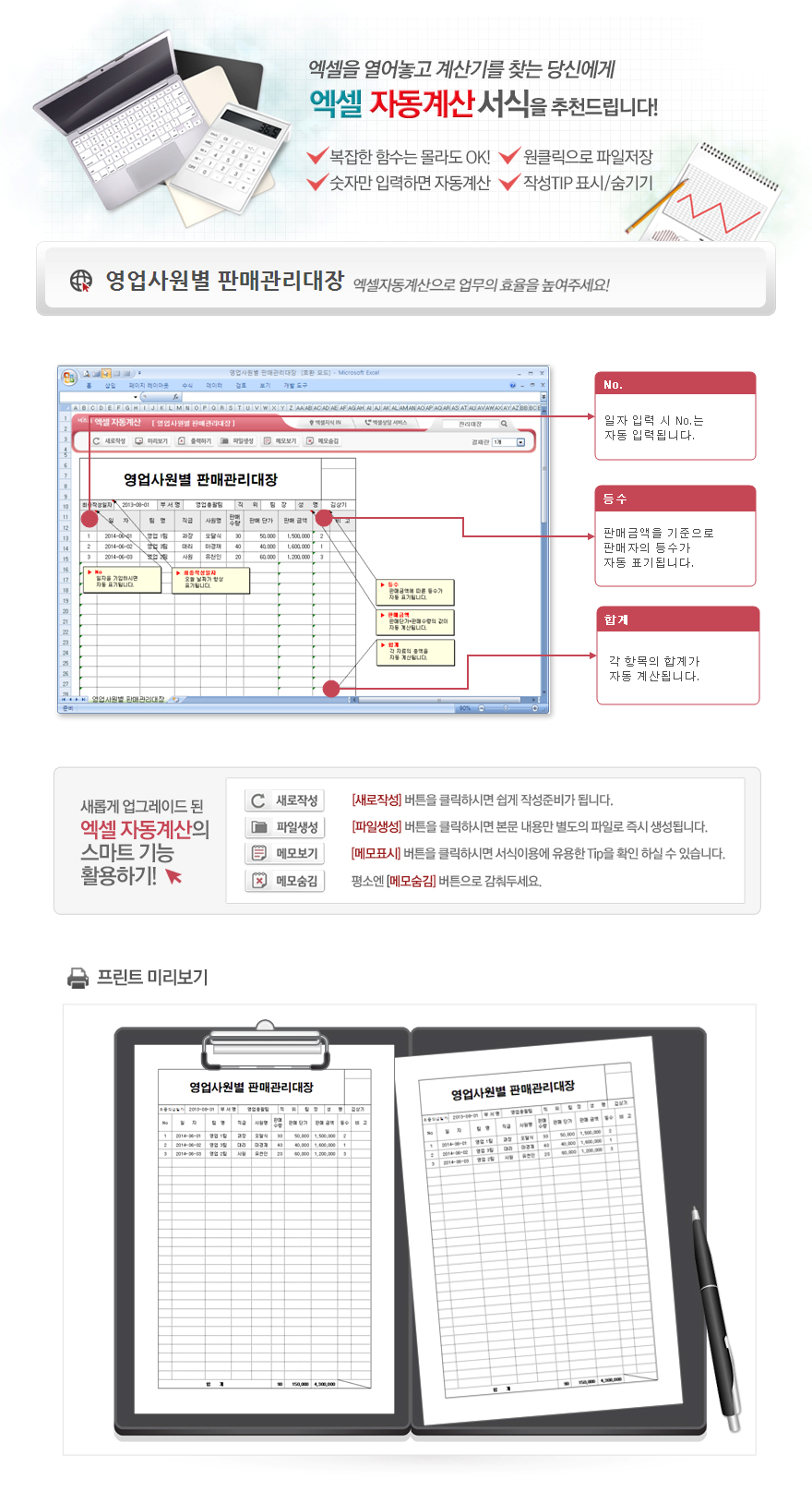 9,000원/월엑셀 자동계산 영업사원별 판매관리대장입니다. 최종작성일자, 부서명, 직위, 성명, 일자, 팀명, 직급, 사원명, 판매수량, 판매단가, 판매금액, 등수, 비고의 항목으로 구성되어 있습니다. 판매금액, 등수 및 각 항목별 총 금액이 자동계산되며, 별도 파일로 저장 가능한 파일생성, 손쉽게 다시 작성이 가능한 새로작성 기능, 결재란 자동조절 기능 이 포함되어 있습니다.