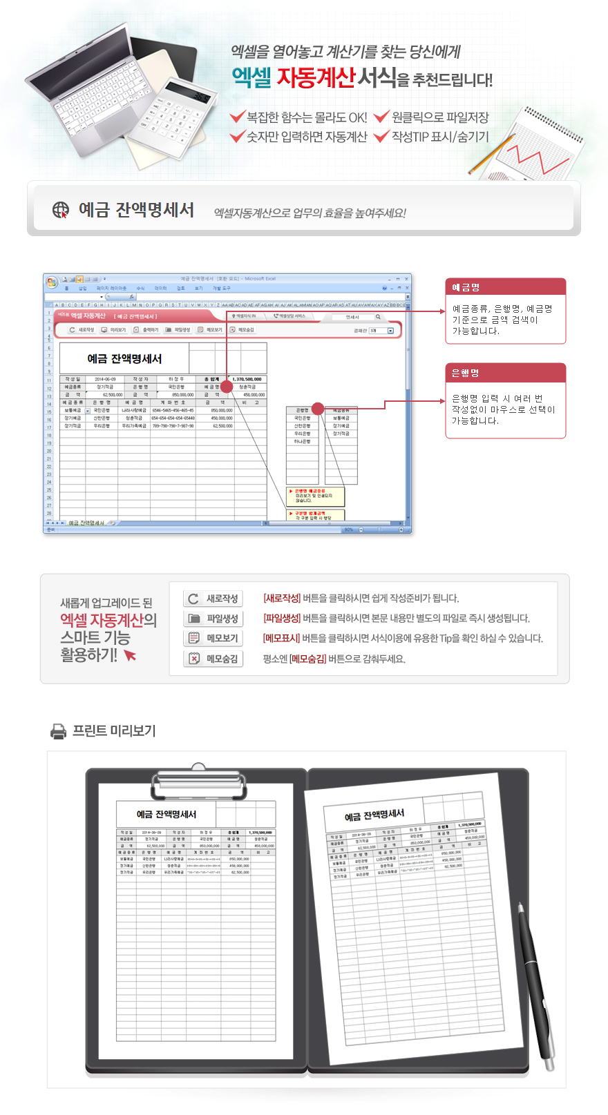 9,000원/월엑셀 자동계산 예금 잔액명세서입니다. 작성일, 작성자, 예금종류, 은행명, 예금명, 계좌번호, 금액, 비고, 총합계 등의 항목으로 구성되어 있습니다. 구분별 총 합계금액이 자동계산되며, 별도 파일로 저장 가능한 파일생성, 손쉽게 다시 작성이 가능한 새로작성 기능, 결재란 자동조절 기능 이 포함되어 있습니다.