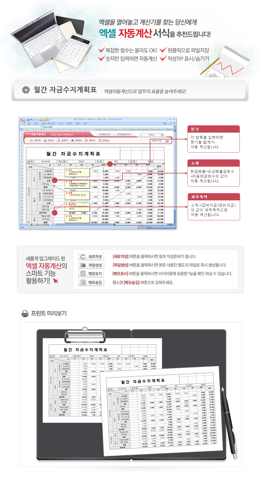 9,000원/월엑셀 자동계산 월간 자금수기 계획표입니다. 날짜, 부서명, 직급, 성명, 경상수지(수입/지출), 재무수지(지출/조달) 등의 항목으로 구성되어 있습니다. 수입/지출의 합계, 과부족액, 각 항목의 분기별/반기별 합계 금액이 자동계산되며, 별도 파일로 저장 가능한 파일생성, 손쉽게 다시 작성이 가능한 새로작성 기능, 결재란 자동조절 기능 이 포함되어 있습니다.