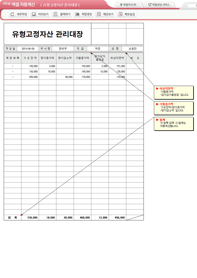 9,000원/월엑셀 자동계산 유형고정자산 관리대장입니다. 작성일, 부서명, 직급, 성명, 계정과목, 기초잔액, 당기증가액, 당기감소액, 기말증가액, 감가상가충당금, 미상각잔액, 비고의 항목으로 구성되어 있습니다. 기말증가액, 미상각잔액 및 각 항목의 총 합계가 자동계산되며, 별도 파일로 저장 가능한 파일생성, 손쉽게 다시 작성이 가능한 새로작성 기능, 결재란 자동조절 기능 이 포함되어 있습니다.