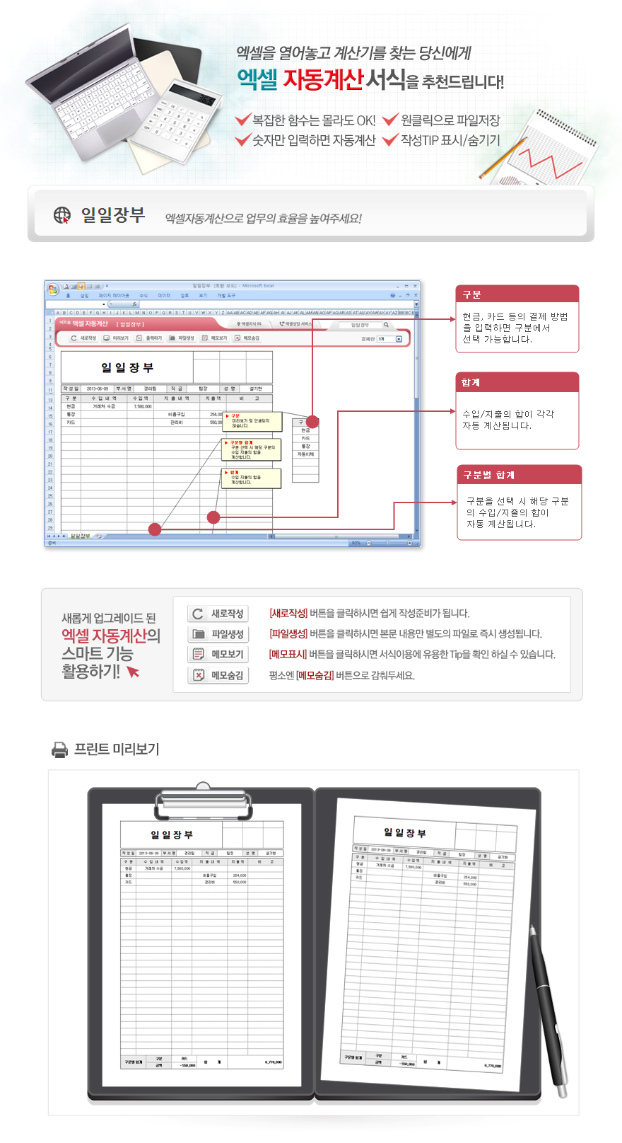 9,000원/월엑셀 자동계산 일일장부입니다. 작성일, 부서명, 직급, 성명, 구분, 수입내역, 수입액, 지출내역, 지출액, 비고의 항목으로 구성되어 있습니다. 구분별 합계과 수입/지출별 합계가 자동계산되며, 별도 파일로 저장 가능한 파일생성, 손쉽게 다시 작성이 가능한 새로작성 기능, 결재란 자동조절 기능 이 포함되어 있습니다.