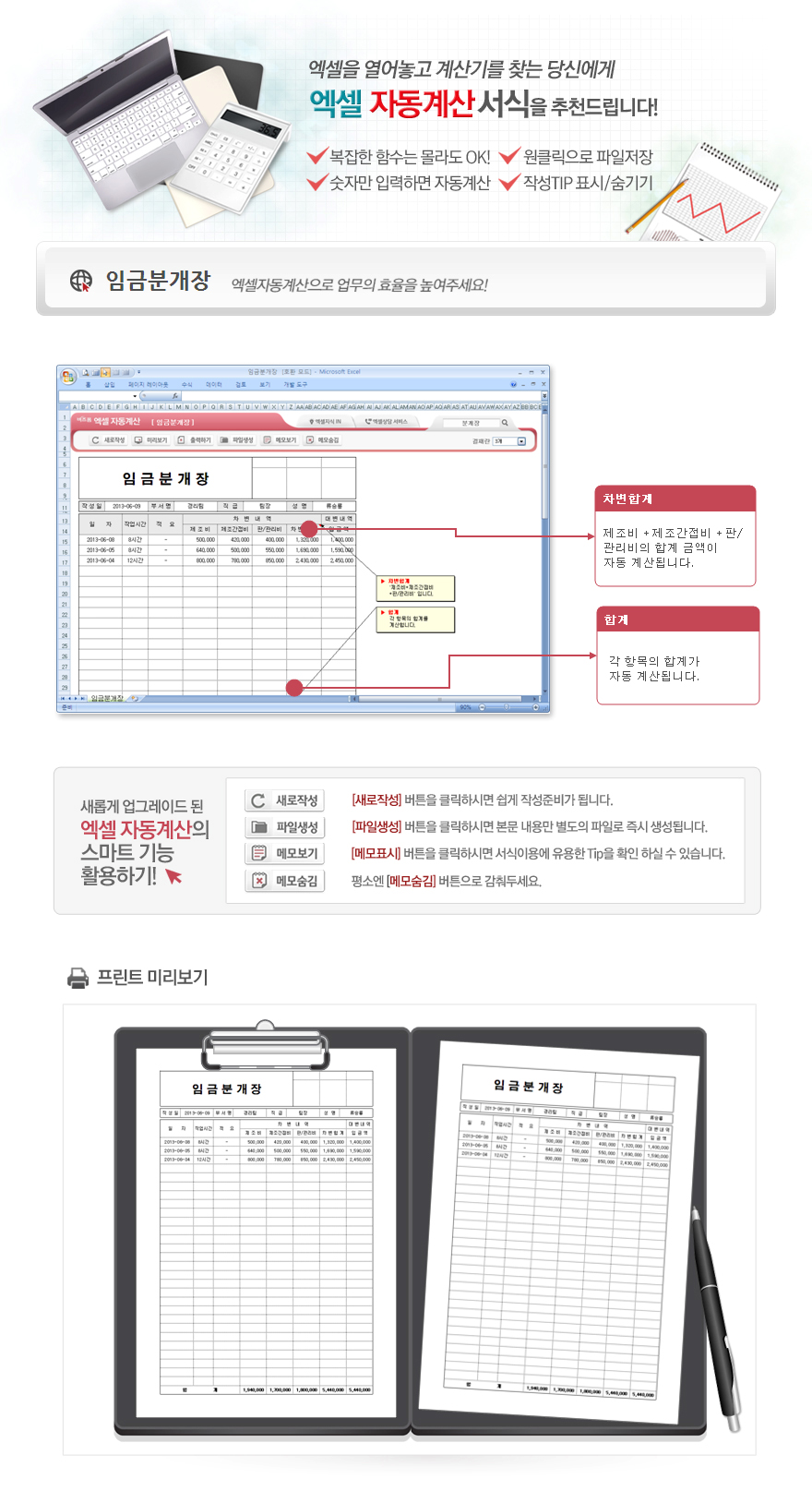 9,000원/월엑셀 자동계산 임금분개장입니다. 작성자 정보와 일자, 작업시간, 적요, 차변내역, 대변내역 등의 항목으로 구성되어 있습니다. 각 차변의 내역을 합산하여 차변합계가 자동계산되고, 각 항목의 합계가 자동계산되며, 별도 파일로 저장 가능한 파일생성, 손쉽게 다시 작성이 가능한 새로작성 기능, 결재란 자동조절 기능 이 포함되어 있습니다.