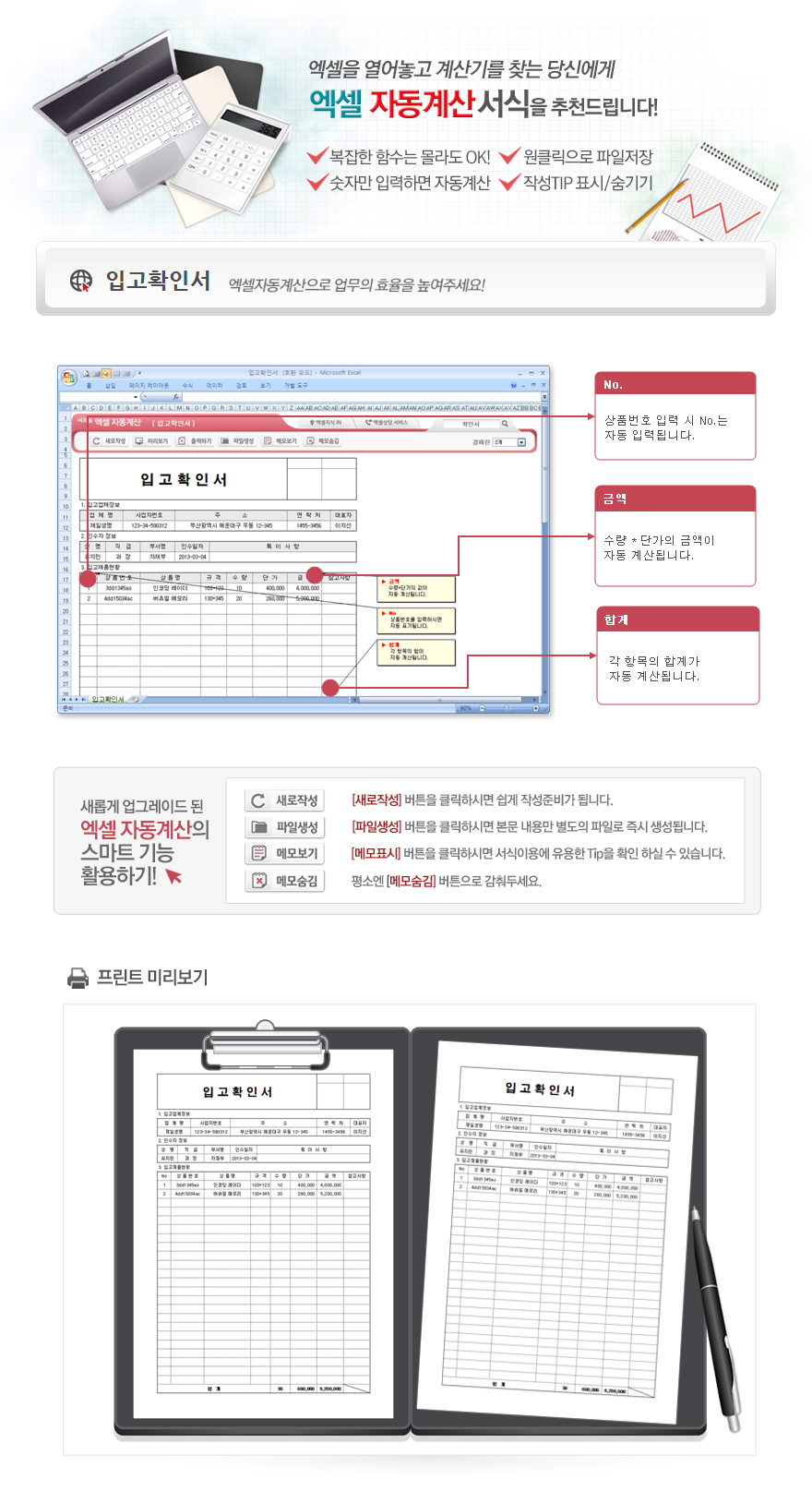 9,000원/월엑셀 자동계산 입고확인서입니다. 입고업체 정보, 인수자정보, 상품명, 규격, 수량, 단가, 금액 등의 항목으로 구성되어 있습니다. 단가*수량으로 금액이 자동계산되고, 각 항목의 합계가 자동계산되며, 별도 파일로 저장 가능한 파일생성, 손쉽게 다시 작성이 가능한 새로작성 기능, 결재란 자동조절 기능 이 포함되어 있습니다.