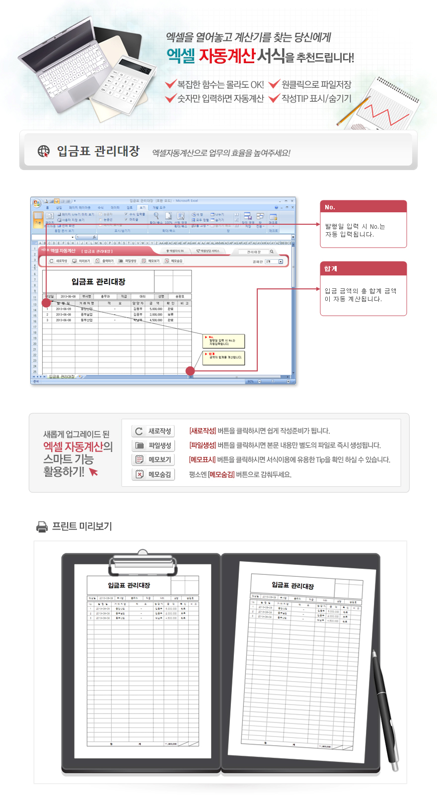 9,000원/월엑셀 자동계산 입금표 관리대장입니다. 작성자 정보와 발행일, 거래처명, 적요, 담당자, 금액 등의 항목으로 구성되어 있습니다. 금액의 합계가 자동계산되며, 별도 파일로 저장 가능한 파일생성, 손쉽게 다시 작성이 가능한 새로작성 기능, 결재란 자동조절 기능 이 포함되어 있습니다.