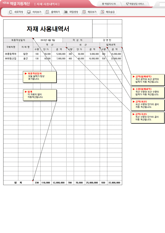 9,000원/월엑셀 자동계산 자재 사용내역서입니다. 구매처명, 자재명, 수량, 단가, 금액, 국산, 외산, 합계내역 등의 항목으로 구성되어 있습니다. 각 단가*각 수량으로 각 금액이 자동계산되고, 국산+외산으로 합계내역이 자동계산됩니다. 그리고 각 항목의 합계 역시 자동계산되며, 별도 파일로 저장 가능한 파일생성, 손쉽게 다시 작성이 가능한 새로작성 기능, 결재란 자동조절 기능 이 포함되어 있습니다.