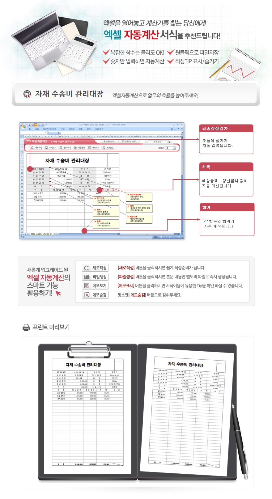 9,000원/월엑셀 자동계산 자재 수송비 관리대장입니다. 작성자 정보와 수송정보, 물품정보, 예상금액, 정산금액, 차액 등의 항목으로 구성되어 있습니다. 예상금액-정산금액으로 차액이 자동계산되고, 각 항목의 합계가 자동계산되며, 별도 파일로 저장 가능한 파일생성, 손쉽게 다시 작성이 가능한 새로작성 기능, 결재란 자동조절 기능 이 포함되어 있습니다.