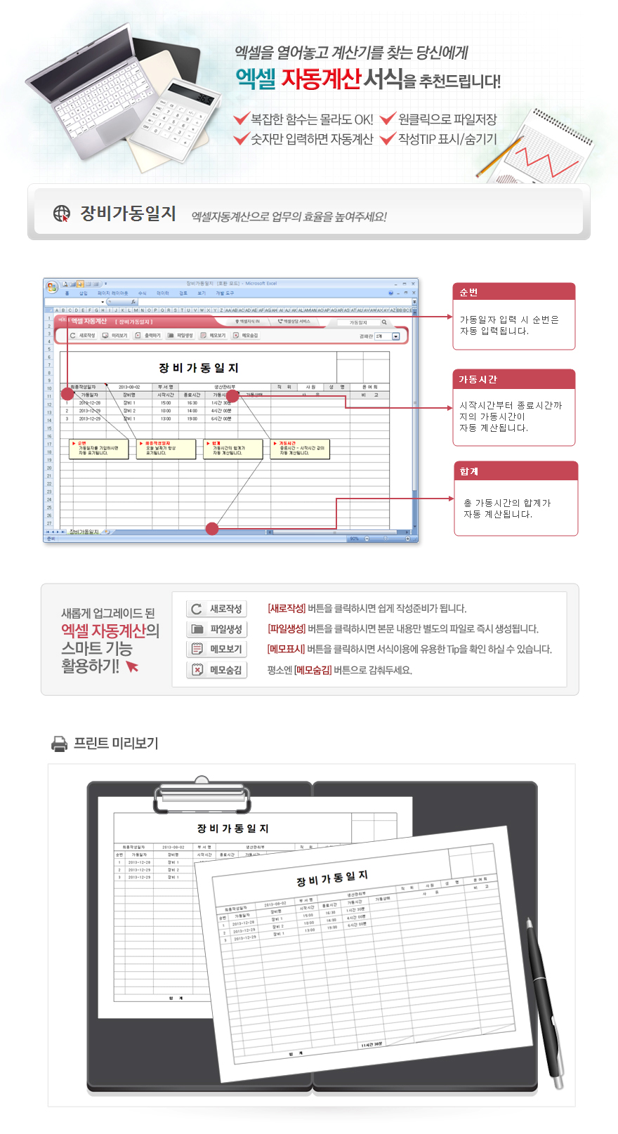 9,000원/월엑셀 자동계산 장비가동일지입니다. 가동일자, 장비명, 시작시간, 종료시간, 가동시간, 가동상태, 사유의 항목으로 구성되어 있습니다. 시작시간과 종료시간을 입력하면 가동시간과 합계가 자동계산되며, 별도 파일로 저장 가능한 파일생성, 손쉽게 다시 작성이 가능한 새로작성 기능, 결재란 자동조절 기능 이 포함되어 있습니다.