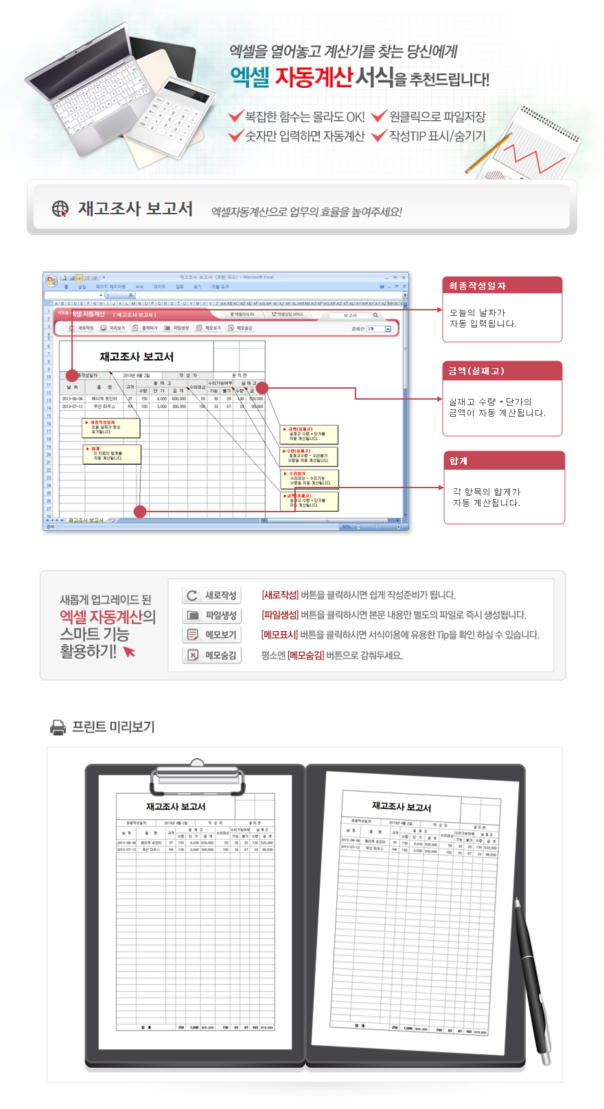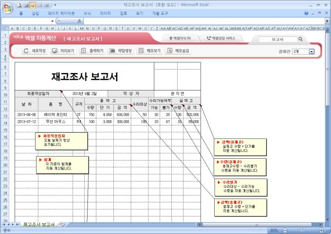 9,000원/월엑셀 자동계산 재고조사 보고서입니다. 품명, 규격, 총재고, 수리대상, 수리가능여부, 실재고의 항목으로 구성되어 있습니다. 총재고 수량, 단가를 입력하면 금액이, 수리대상과 수리가능을 입력하면 수리 불가량, 실재고 수량,금액이 계산되고 각 항목의 합계가 자동계산되며, 별도 파일로 저장 가능한 파일생성, 손쉽게 다시 작성이 가능한 새로작성 기능, 결재란 자동조절 기능 이 포함되어 있습니다.