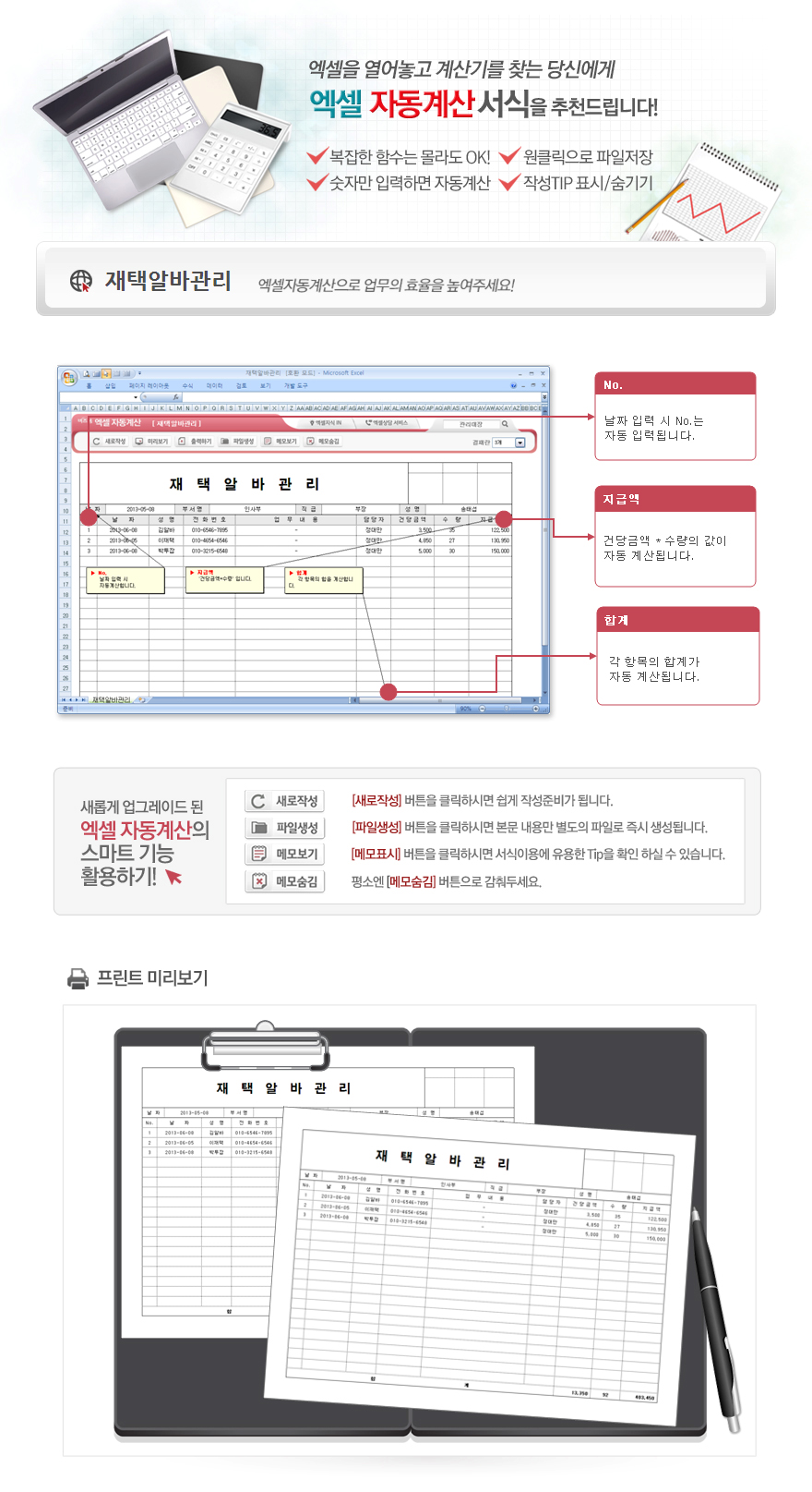 9,000원/월엑셀 자동계산 재택알바관리입니다. 날짜, 성명, 업무내용, 담당자, 건당금액, 수량의 항목으로 구성되어 있습니다. 건당금액과 수량을 입력하면 지급액이 계단되고, 각 항목의 합계가 자동계산되며, 별도 파일로 저장 가능한 파일생성, 손쉽게 다시 작성이 가능한 새로작성 기능, 결재란 자동조절 기능 이 포함되어 있습니다.
