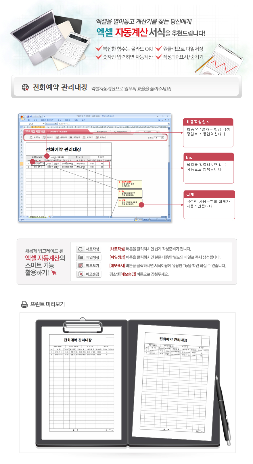 9,000원/월엑셀 자동계산 전화상담일지입니다. 날짜, 구분, 구분목록, 시간, 상담내용, 처리결과의 항목으로 구성되어 있습니다. 구분과 처리결과를 입력하면 상담구분란에 총 건수와 상담 구분, 처리결과가 자동계산되며, 별도 파일로 저장 가능한 파일생성, 손쉽게 다시 작성이 가능한 새로작성 기능, 결재란 자동조절 기능 이 포함되어 있습니다.