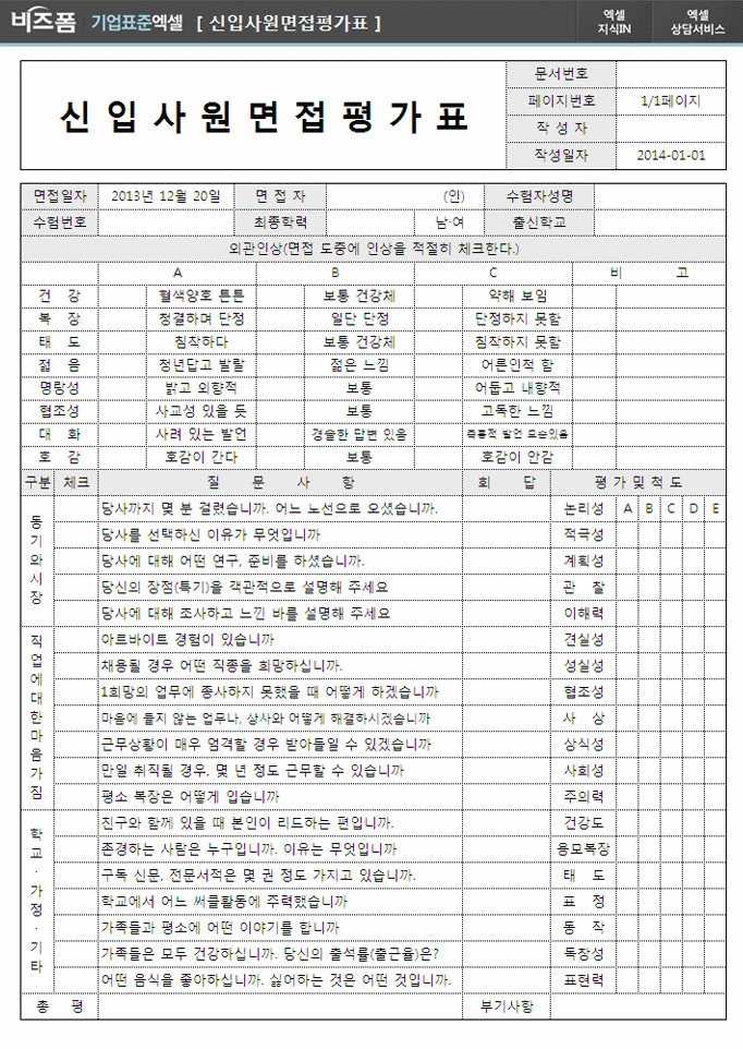 9,000원/월신입사원 면접 진행시 사용할 수 있는 신입사원 면접 평가표입니다. 면접일자, 면접자, 수험자성명, 최종학력, 외관인상, 질문사항, 회답, 평가 및 척도, 총평 등으로 구성되어 있습니다.