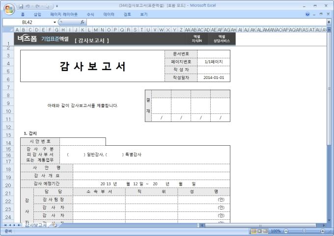 9,000원/월감사에 관련된 전반적인 내용 및 결과를 기록하는 감사 보고서입니다. 시안번호, 감사구분, 사안명, 감사개요, 감사 예정기간, 감사자, 감사항목, 감사지적사항, 조치의견 등으로 구성되어 있습니다.