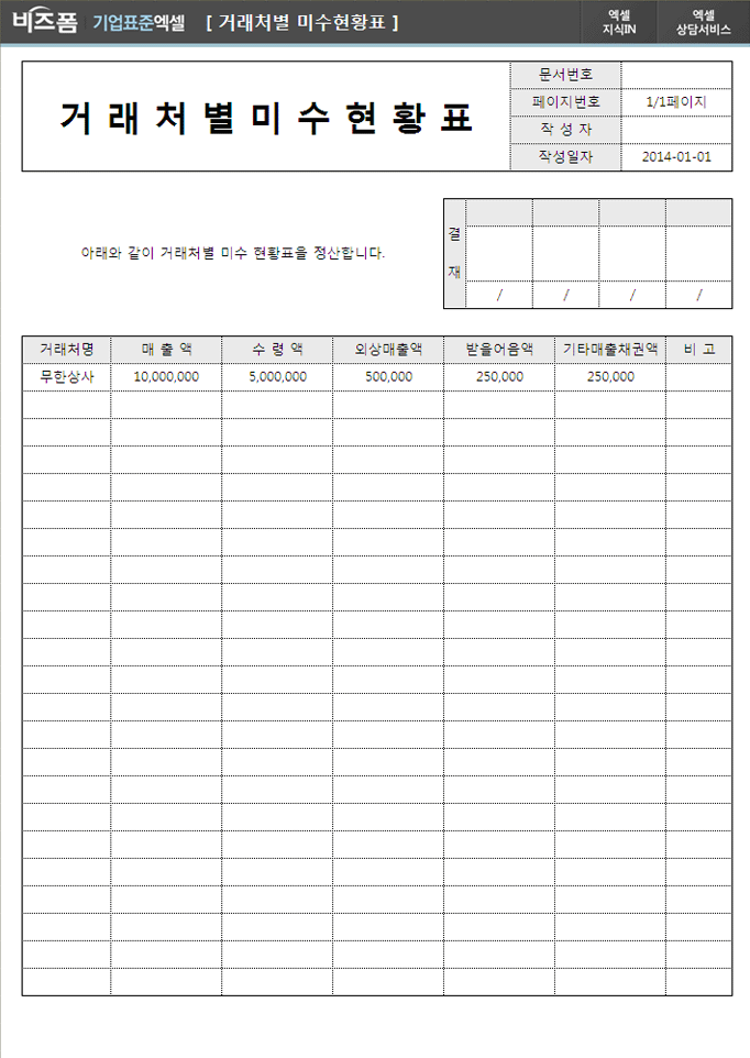 9,000원/월거래처별로 미수 현황을 기록할 수 있는 거래처별 미수 현황표입니다. 거래처명, 매출액, 수령액, 외상매출액, 받을 어음액, 기타 매출채권액 등으로 구성되어 있습니다.