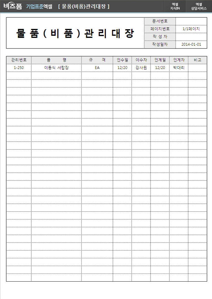 9,000원/월회사 내에 구비(비치)되어 있는 물품 및 비품을 기록한 물품(비품)관리대장입니다. 관리번호, 품명, 규격, 인수일, 인수자, 인계일, 인계자 등으로 구성되어 있습니다.