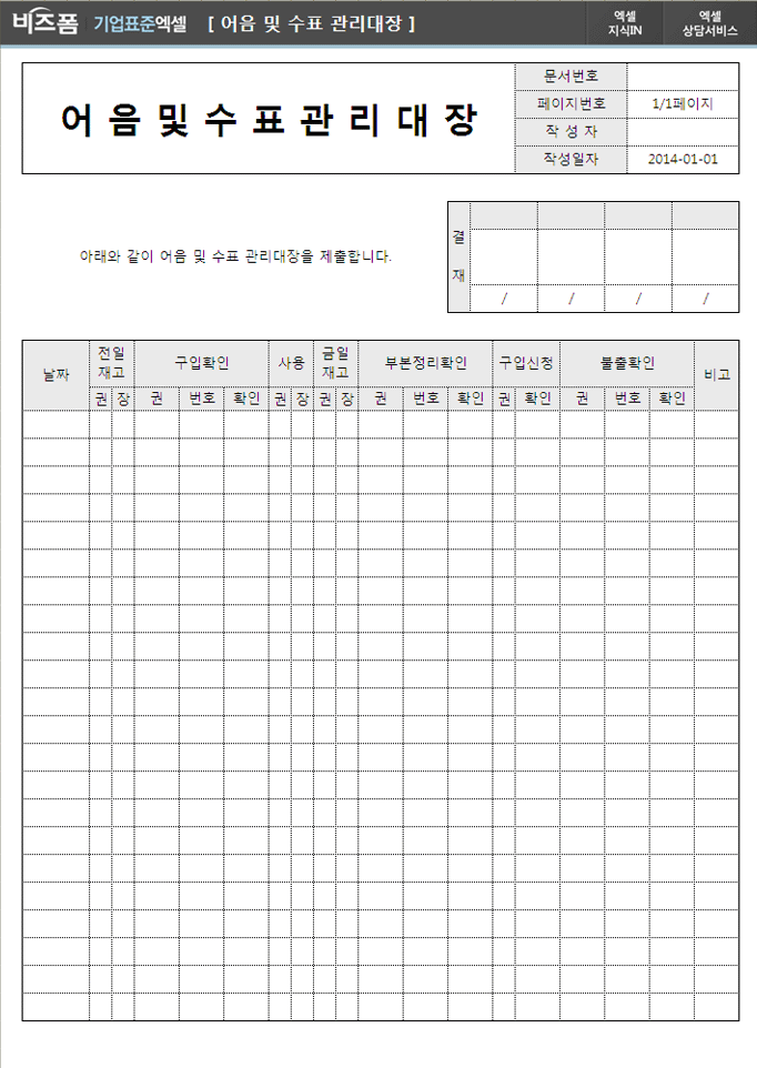 9,000원/월어음 및 수표의 정보를 기록, 관리하는 어음 및 수표 관리대장입니다. 날짜, 전일재고, 구입확인, 사용내역, 금일재고, 부본정리확인, 구입신청, 불출확인 등으로 구성되어 있습니다.