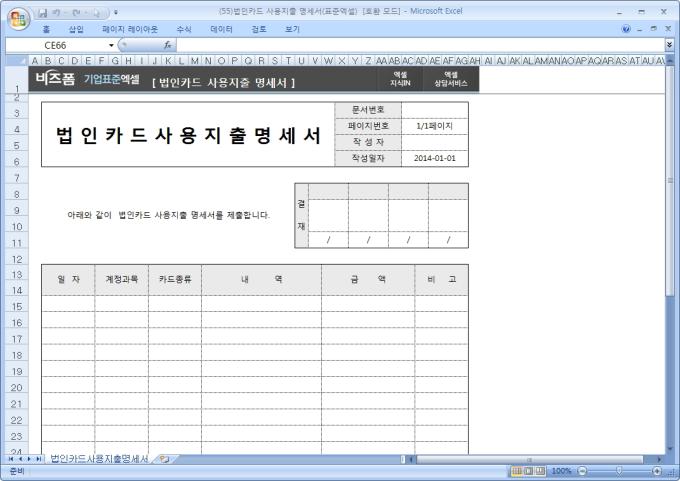 9,000원/월법인카드의 지출 내역이 기록 가능한 법인카드 사용지출 명세서입니다. 일자, 계정과목, 카드종류, 내역, 금액 등으로 구성되어 있습니다.