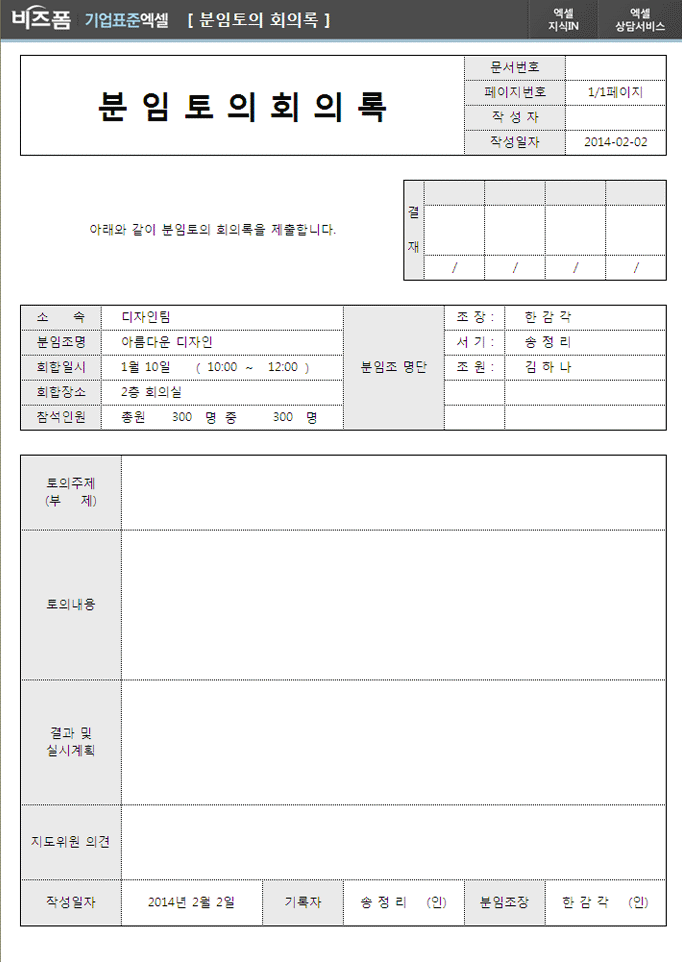 9,000원/월회의시 주제와 내용, 결과 등을 기록할 수 있는 분임토의 회의록입니다. 소속, 분임조명, 회합일지, 회합장소, 참석인원, 분임조 명단, 토의주제, 토의내용, 결과 및 실시계획, 지도위원 의견, 작성일자, 기록자 등으로 구성되어 있습니다.