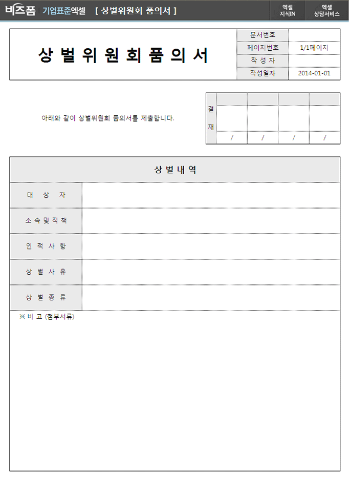 9,000원/월상벌내역을 기록할 수 있는 상벌위원의 품의서입니다. 대상자, 소속 및 직책, 인적사항, 상벌사유, 상벌종류, 첨부서류 등으로 구성되어 있습니다.