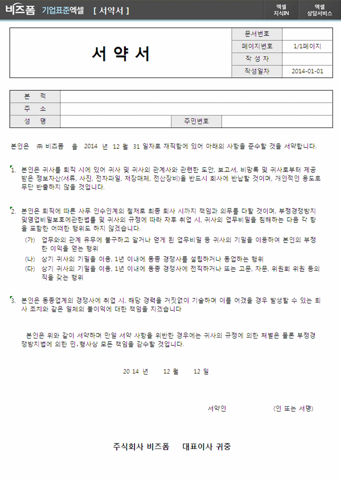 9,000원/월사원의 입사시, 회사의 보안 유지와 인수인계를 위한 서약서입니다. 본적, 주소, 성명, 주민번호 등으로 구성되어 있습니다.