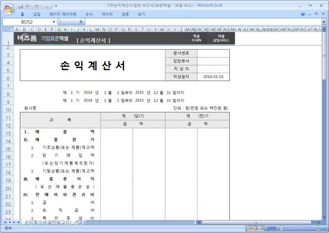 9,000원/월매출액을 기준으로 경상/특별/순이익을 기록할 수 있는 손익계산서입니다. 과목, 금액, 매출원가, 매출총이익, 판매비와 관리비 등으로 구성되어 있습니다.