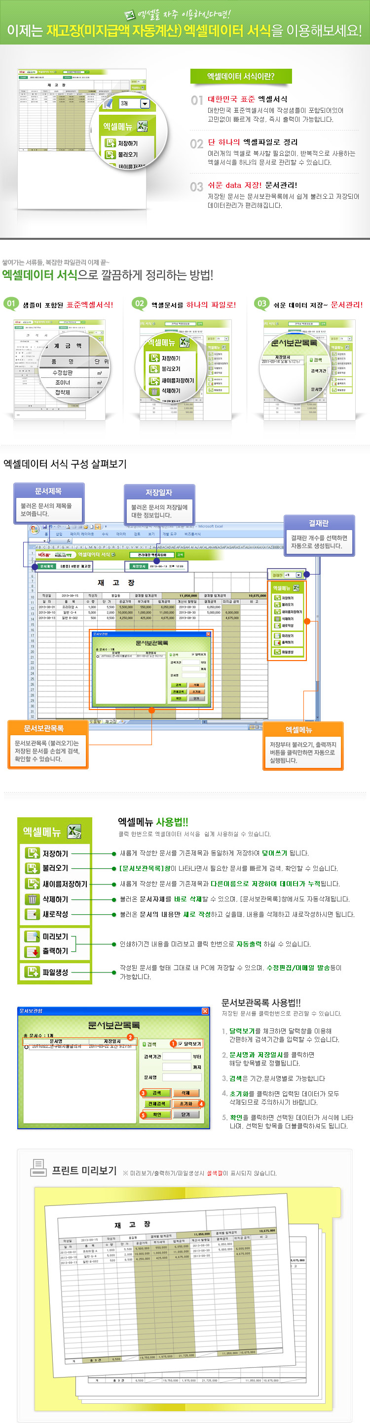 9,000원/월일자별 거래내역과 결제내역을 함께 기록 할 수 있는 가로형 재고장 서식입니다. 공급가액, 부가세액, 합계금액, 미지급 금액의 항목이 모두 자동계산되며, 각 항목의 총합과 건수까지 자동으로 추출됩니다. A4 1페이지를 기준으로 작성 건별로 저장, 수정, 불러오기, 별도 파일로 저장이 가능한 엑셀 데이터 서식입니다.