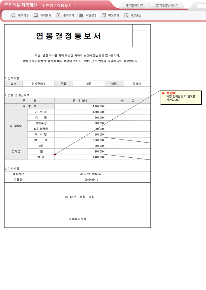 9,000원/월엑셀자동계산 연봉결정통보서입니다.수령액, 월 급여액, 성과급, 적용기간, 지급일의 항목으로 구성되어 있습니다. 각 항목의 금액을 입력하면 합계가 자동계산되며, 별도 파일로 저장 가능한 파일생성, 손쉽게 다시 작성이 가능한 새로작성 기능, 결재란 자동조절 기능이 포함되어 있습니다.